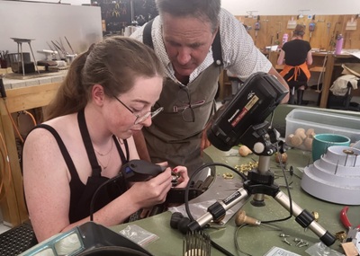 Students learn practical skills like soldering, stone setting, and metal forming, while also developing creative design ideas. They even tackle modern design challenges such as using recycled materials and exploring environmental responsibility in jewellery manufacturing.